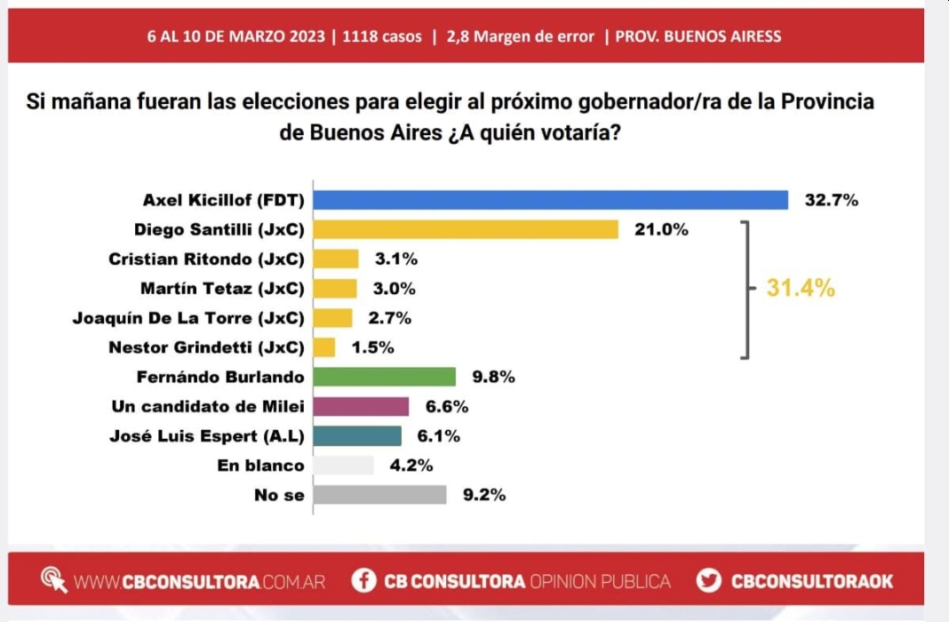 De esta manera, la sumatoria de los posibles precandidatos a Gobernador bonaerense de Juntos por el Cambio da un total de 31,4%, un número muy cercano al 32,7% que obtuvo Kicillof.