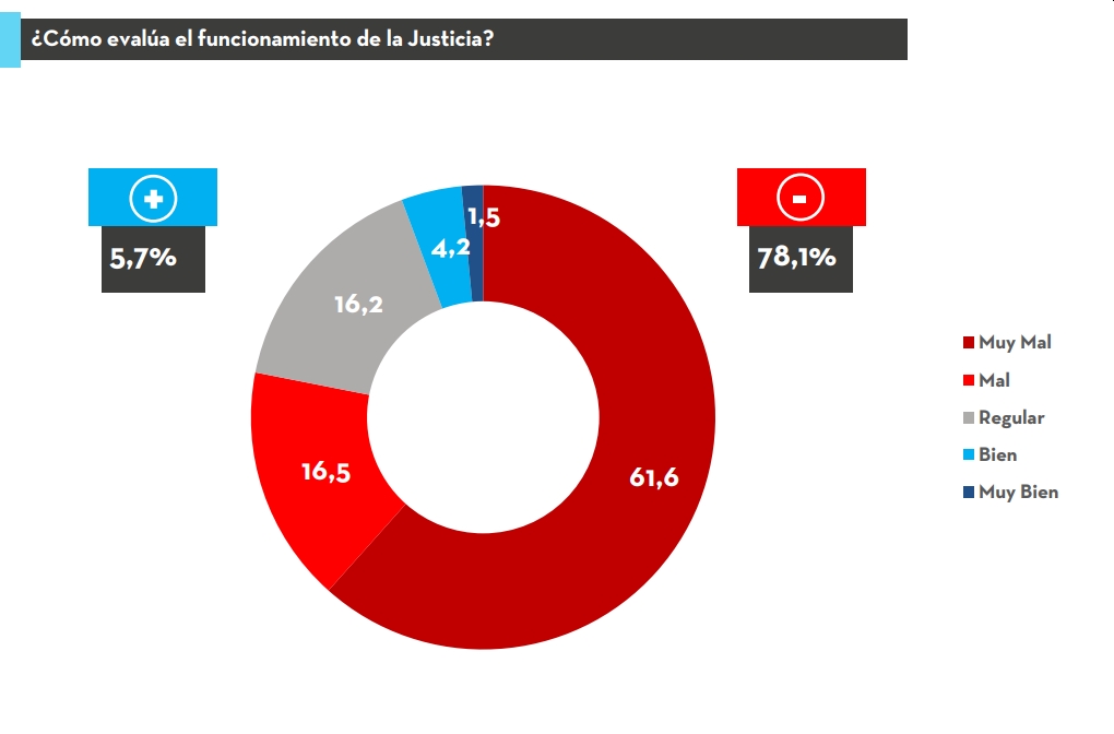 De hecho, más del 78% evalúa mal o muy mal la actualidad de la Justicia en general, mientras que solo un 4% la ve bien, y un 16% regular.