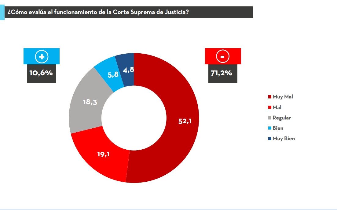 Respecto del funcionamiento del máximo tribunal de Justicia, más del 71% evalúa mal o muy mal a la Suprema Corte, contra un 10,6% que cree que está bien o muy bien y un 18,3% que considera que trabaja de forma regular.
