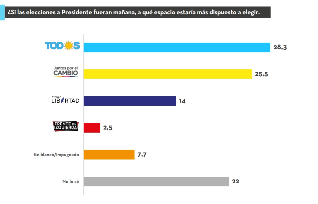 Respecto del mapa electoral camino a las presidenciales de 2023, y tomando la inclinación ciudadana por espacios, el Frente de Todos aparece a la cabeza con casi 3 puntos de ventaja sobre Juntos por el Cambio. Más atrás aparecen los libertarios.