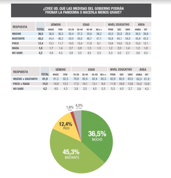 Además casi el 82% creen que las medidas tomadas por el Gobierno podrían frenar la pandemia o hacerla menos grave, mientras que el 63,7% cree que en un mes la situación será menos grave que hoy.