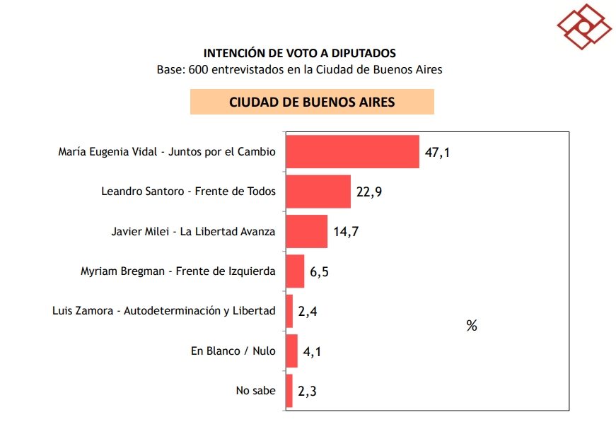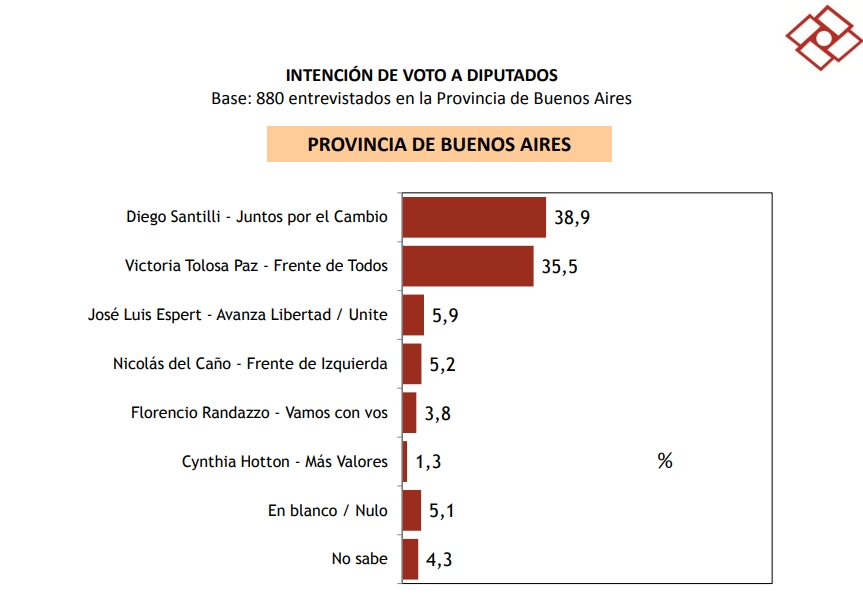 En tanto, en el ámbito de la Provincia de Buenos Aires, el escenario asoma como más parejo y el Frente de Todos superaría en el distrito su promedio nacional, aunque seguiría por detrás de Juntos por el Cambio. Sin embargo la diferencia está muy cercana al empate técnico con un 4% de indecisos. Diego Santilli lideraría con casi 39 puntos, por sobre los 35,5 de Victoria Tolosa Paz, mientras que el liberal José Luis Espert aparece con casi 6 puntos.