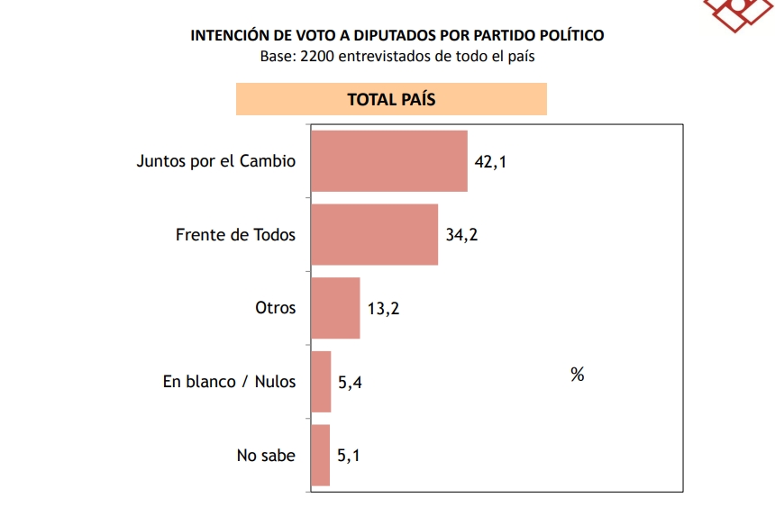 De acuerdo al último sondeo estadístico realizado por la consultora Ricardo Rouvier & Asociados, Juntos por el Cambio confirmaría la ventaja obtenida en las recientes PASO a nivel nacional, con una diferencia que estaría en el orden de los 8 puntos sobre el Frente de Todos, mientras que habría un 5% de indecisos.