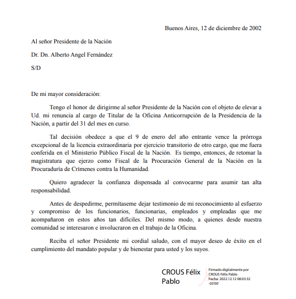 Aquí la carta completa escrita por Félix Crous y enviada al Presidente de la Nación, al que agradece la confianza y el apoyo recibido durante estos años de gestión.
