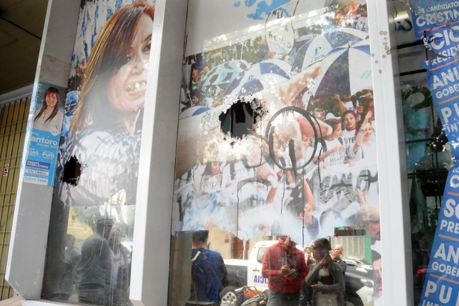 “En la madrugada del sábado, a las 0:59 horas recibimos en el frente del local, 5 impactos de un arma de fuego de grueso calibre, de los cuales balística encontró 4 casquillos. Se trata de un arma de guerra, una Itaka 1270”, relató Marina Santoro, concejal del FpV en Mar del Plata, y presidenta de la comisión de Derechos Humanos de legislatura local.