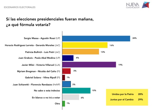 Así, Juntos por el cambio alcanzaría los 29 puntos contra 28 de Unión por la Patria, siendo Sergio Massa el candidato más votado en forma individual. En la interna opositora, Horacio Rodríguez Larreta aparece con ventaja de 3% sobre su rival, Patricia Bullrich. En tanto, el candidato libertario, Javier Milei sumaría 19%, quedando en tercer lugar.