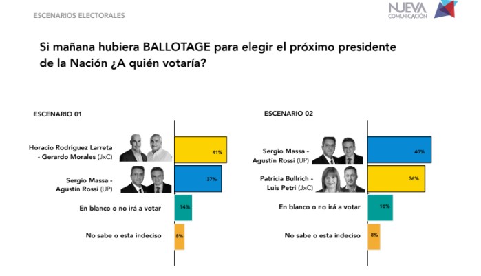 Si fuera Patricia Bullrich la candidata de Juntos, la dirigente caería ante Massa por 4 puntos de distancia, mientras que el actual ministro de Economía también se impondría sobre el líder libertario por 5 puntos.