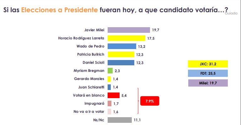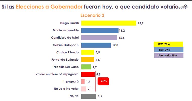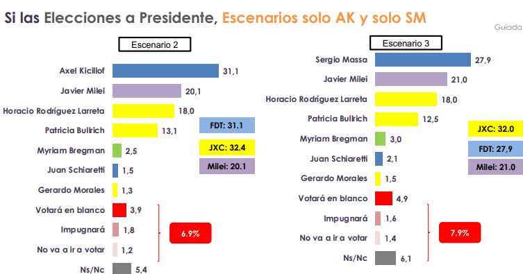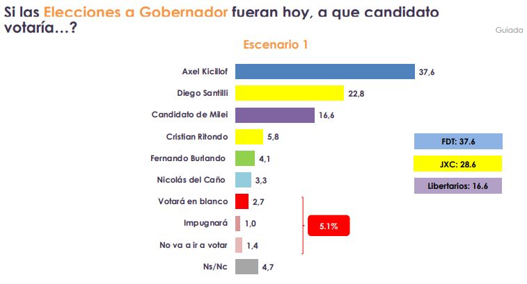 En el escenario con Kicillof como candidato presidencial del Frente de Todos, el actual gobernador pasarían los 30 puntos, peleando cabeza a cabeza con la suma de Juntos, entre las adhesiones a Larreta, Bullrich y Morales, mientras que tercero quedaría Milei.