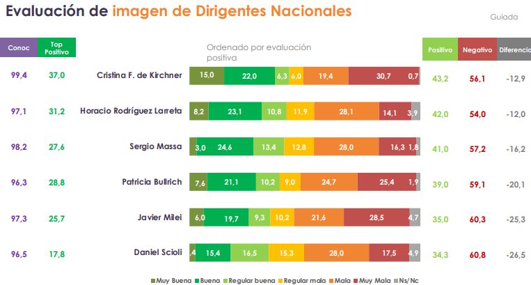 En cuanto a la imagen de los dirigentes políticos, el muestreo consolida el liderazgo de Cristina Kirchner en provincia de Buenos Aires, mientras que Horacio Rodríguez Larreta y Sergio Massa le seguirían en cuanto a imagen positiva, por encima de Patricia Bullrich, Javier Milei y Daniel Scioli.