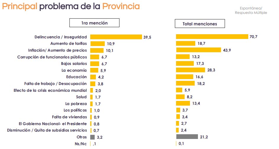 Entre los temas de mayor interés de la sociedad, aparece la inseguridad en el top de las preocupaciones, seguido por la inflación que figura como la segunda mención más escuchada. La economía, la pobreza y los temas laborales también van a la cabeza de los tópicos más mencionados.