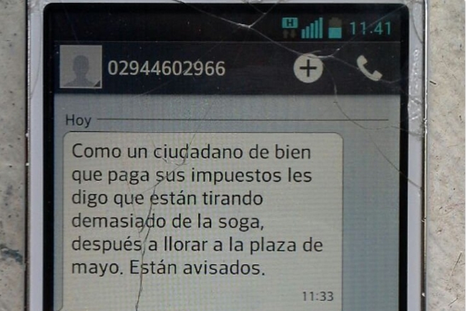 «Realizábamos el programa de la mañana, un programa informativo y participativo, y en el teléfono de la radio recibimos un mensaje que decía que estábamos tirando demasiado de la soga, van a tener que ir a llorar a la Plaza de Mayo y que están advertidos”, relató en Radio 10 Rodrigo Tornero, periodista de FM Alas de la ciudad rionegrina de El Bolsón, sobre las amenazas recibidas al teléfono de la emisora, situación que se relacionaría directamente con la cobertura de la emisora en el caso Maldonado.